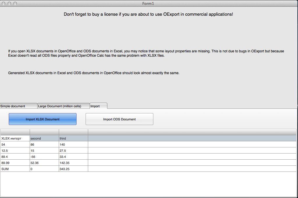 OExport allows you to generate and read XLSX, XLS, ODS and CSV spreadsheets directly from Delphi & Lazarus. It has also an import feature - you can extract data from XLSX, XLS, ODS and CSV files. Please see the feature matrix below for more details.